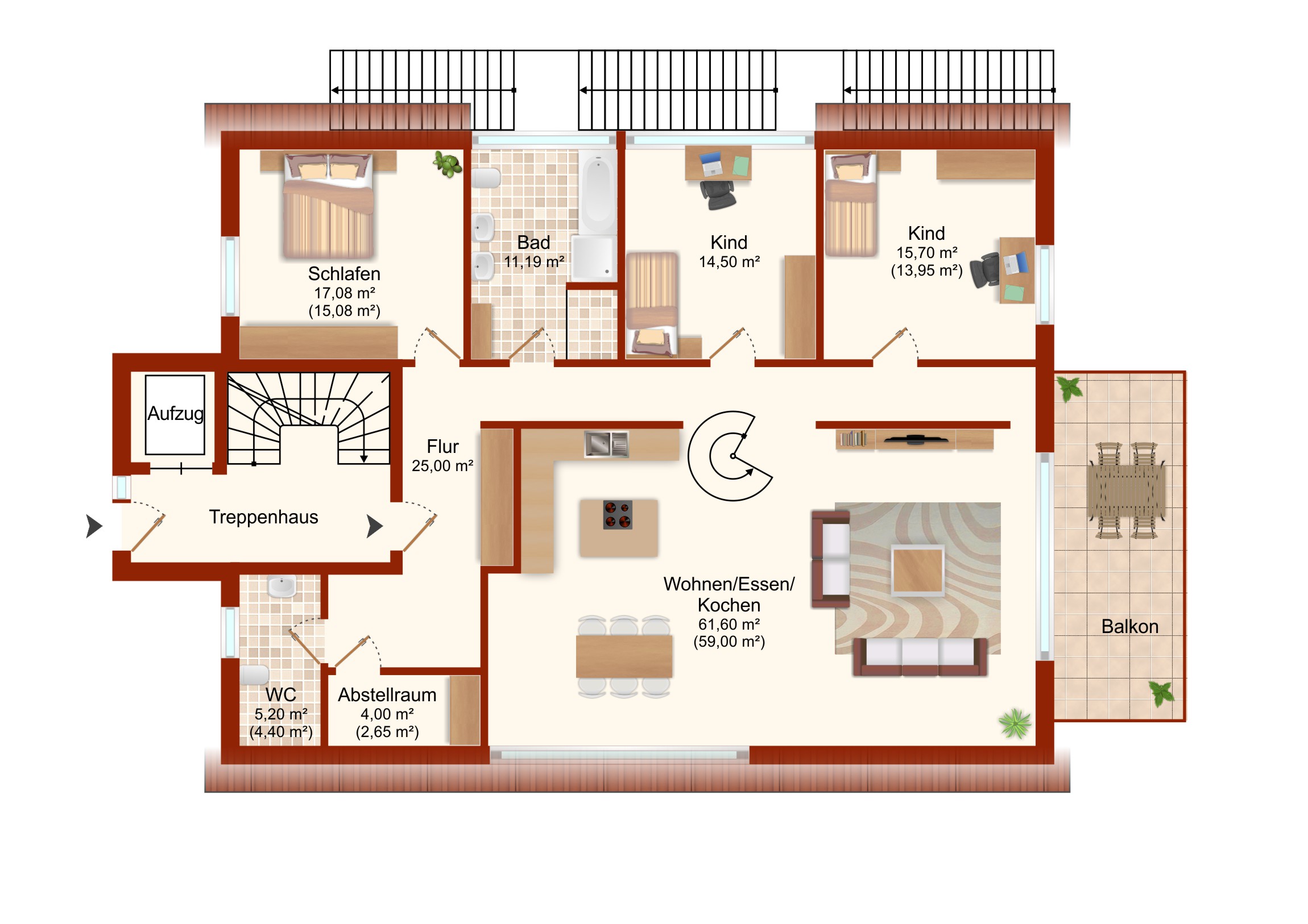 – Wohn- Essraum mit offener Küche ca. 59 m²
